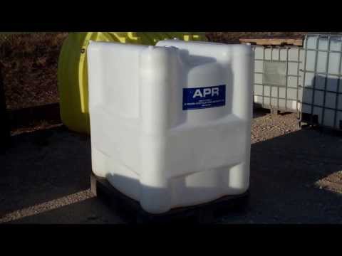 Okay, here we have a video of a 275 gallon all-poly tote with a 2-inch discharge ball valve at the bottom. There is also an all-poly skid that's for cliff table from both sides, as you can see here. At the bottom, it is a 275 gallon total capacity, manufactured by Hoover. As you can see, we're going to take a quick walk around the tote and also look down here at the discharge. It has a 2-inch banjo ball valve with a quick connect disconnect cap and a male cam lock fitting on the end. There is also a tether to keep the cap from blowing away. As we walk around the tote, you'll see it is an all-poly construction with the forklift double bottom all the way around and a nice lid. There are a couple of bugs right here on the top. These totes are common in the 275 gallon and 330 gallon sizes. The one in our video is a 275. Give us a call or visit our website, Seavers Poly Tanks. The website is polytanksales.com.